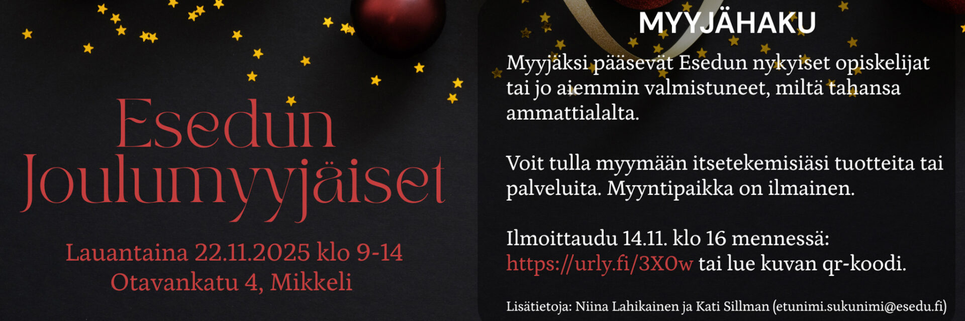 Myyjähaku Esedun joulumyyjäisiin on avoinna, ja mukaan voivat ilmoittautua sekä nykyiset että valmistuneet opiskelijat.