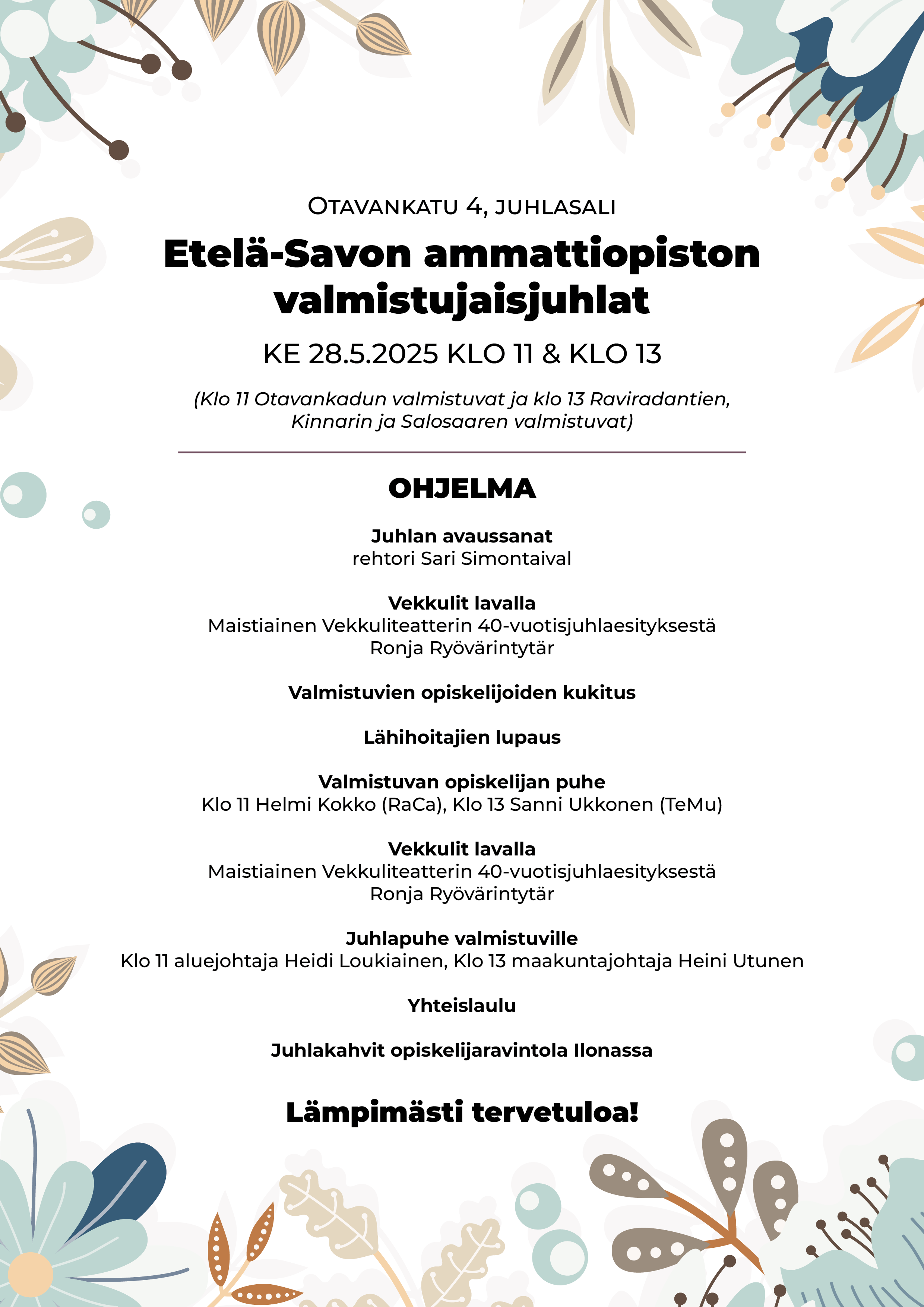 Juhlaan kutsutaan kaikki 1.1.2025 – 31.5.2025 aikavälillä valmistuvat Mikkelin toimipisteiden opiskelijat. Pyydämme ilmoittautumaan juhlaan sekä omasta että mahdollisten läheistesi osallistumisesta viimeistään perjantaina 16.5.2025 ilmoittautumislomakkeella. Erillistä kutsua ei lähetetä ilmoittautumisajan jälkeen.